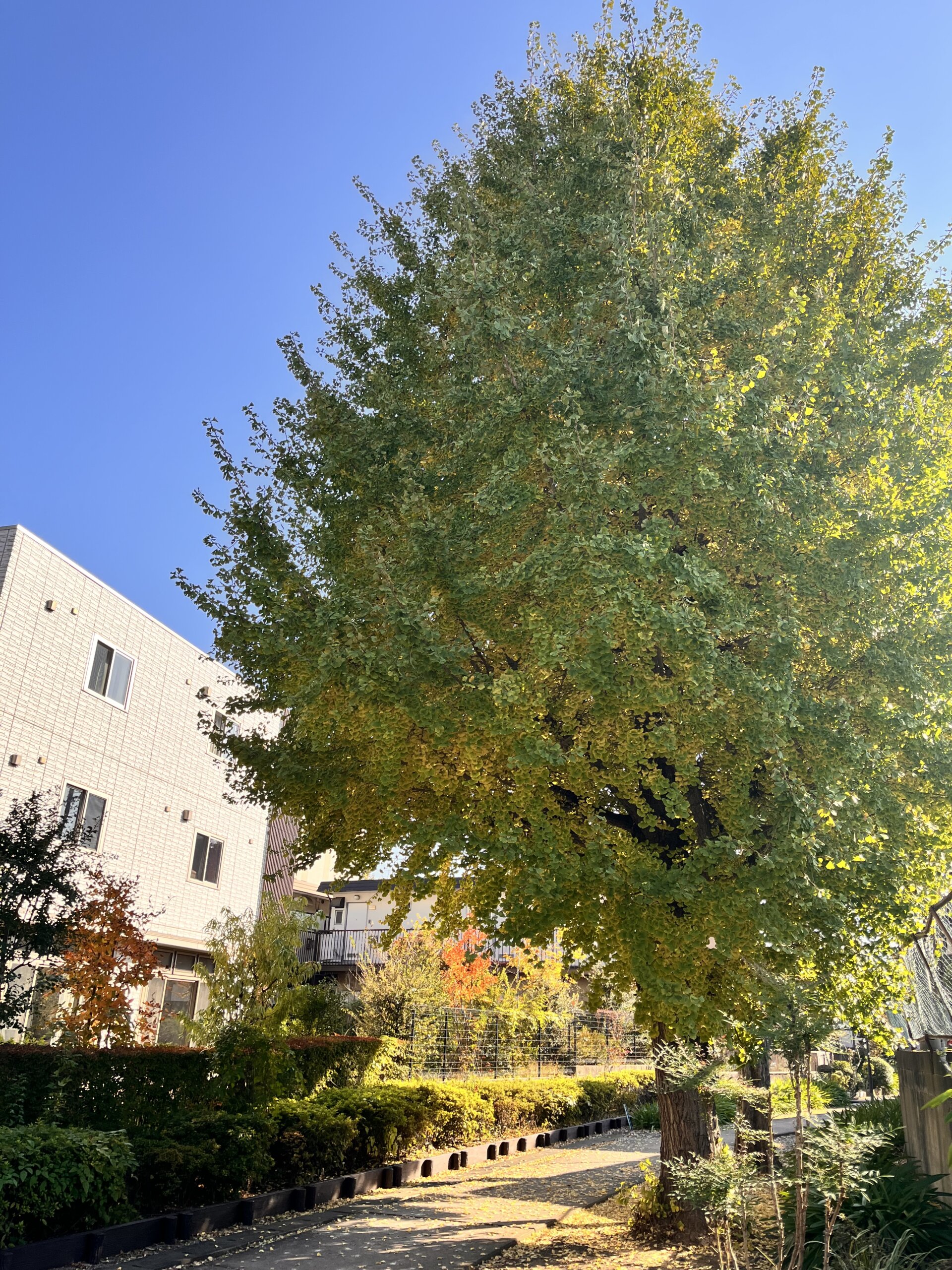 武蔵小杉石水邸前のイチョウが色づき始めました。 毎朝、実を拾いにいらしているご近所の方もおられます。 黄金色になるのが楽しみです
